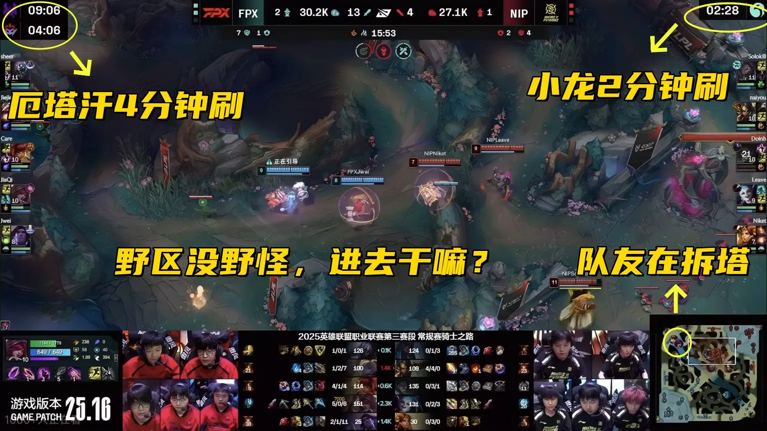 葬送优势的那一波团战,小龙还有2分钟刷新,厄塔汗还剩4分钟,这条龙是FPX的停牌龙,所以龙的优先级很高,只要拿了龙,着急的就是NIP,而且2分钟空档期,是有时间整补打厄塔汗团战的,不知道FPX咋想的,跑去上半区做视野,管泽元看完FPX的决策,都忍不住开喷:不配赢。