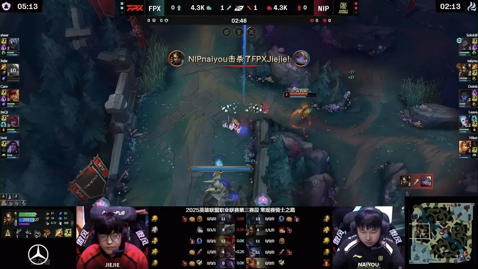 决胜局对于FPX来说,是真的很可惜,前期大优势开局的情况下,愣是被NIP翻盘输掉比赛,Jiejie的表现非常糟糕,用“战犯”来形容,都一点不夸张,咱们简单回顾一下第五把,大家就知道Jiejie有多逆天了,比赛刚上来,Nip就选择入侵野区,想打一级团,结果奶油被控住直接送出一血。