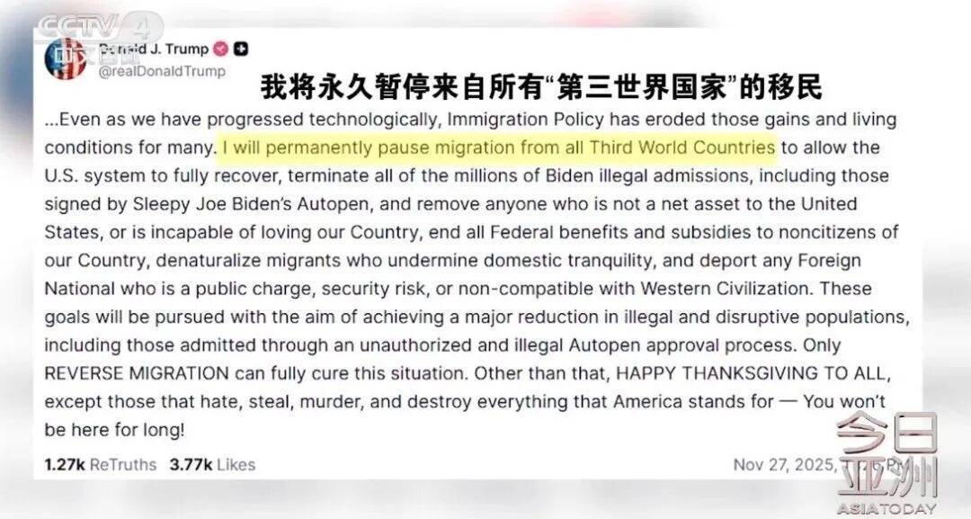 特朗普说,美国国土安全部确认,被捕的枪击事件嫌疑人2021年9月从阿富汗入境美国。美国必须重新审查在拜登执政期间从阿富汗入境的“每一名外国人”。